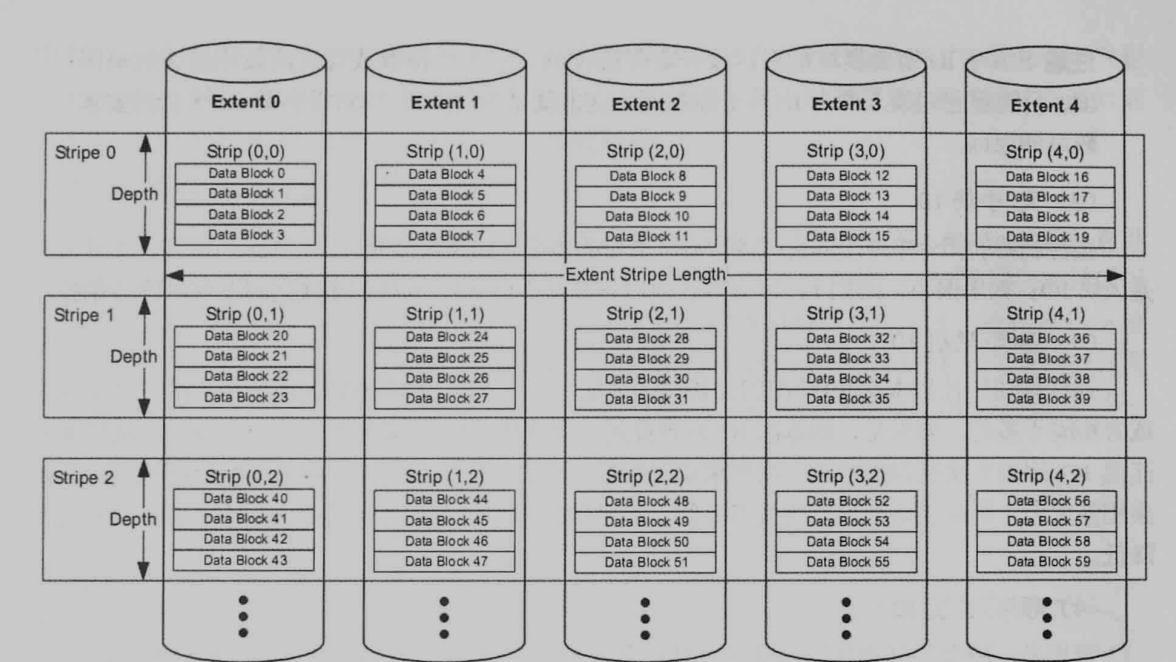 - RAID0 在逻辑上讲多个磁盘横向划分为 Stripe(条带),而 Strip是条带单元,称之为Segment,如下图 有五个条带单元构成了一个Stripe,这个条带的宽度是磁盘数即 5,条带的深度为4(条带单元的块个数)