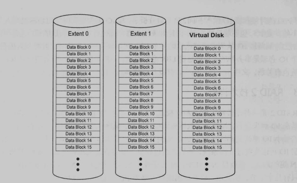RAID2 比较特殊,已经淘汰了…. 可以理解为 RAID0带的深度为1,这里的1 是1b,但是我们知道磁盘最小读写单位是一个扇区 512b,那不是浪费了? 加入现在有四块磁盘,写512b数据,控制器会对数据进行分割,怎么分呢?第一块磁盘写入的顺序是 1,5,14,第二块磁盘写入的顺序是 2,6,10,15,以此类推,就是说把数据分割1b的粒度分割,逐个写到磁盘,写完的话每个磁盘占了128b,剩下的空间怎么办呢?等下次的写的时候,把数据先读出来,并且和待写入的数据合并,然后再按照刚才的方式写数据… 这个效率肯定是大打折扣,但是这样可以保证任意时刻,这个每个盘都不会空闲,性能压榨到极致,也说明了,为什么比较适用于大io,但是这技术,可以提高 连续io。